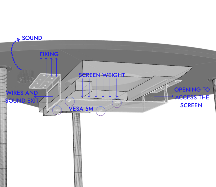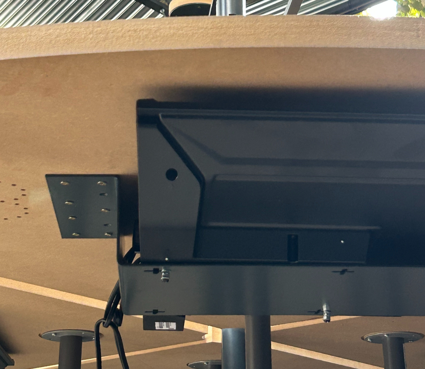 One of the project’s primary technical challenges was the secure installation of digital displays beneath the table surface. I engineered a custom steel support system designed to hold the hardware against gravity while maintaining a minimalist profile.